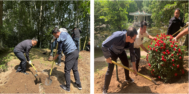 “种一颗树苗,添一抹新绿,播一分希望”,在植树现场,总务处党支部与后勤党总支成员分工协作、配合默契、齐心协力,扛着铁锹、提着水桶,挖坑填土、扶苗浇水,在人工湖假山周边共栽下月季树、月季球等50余株树苗。最后,大家为自己树苗挂上专属标牌。