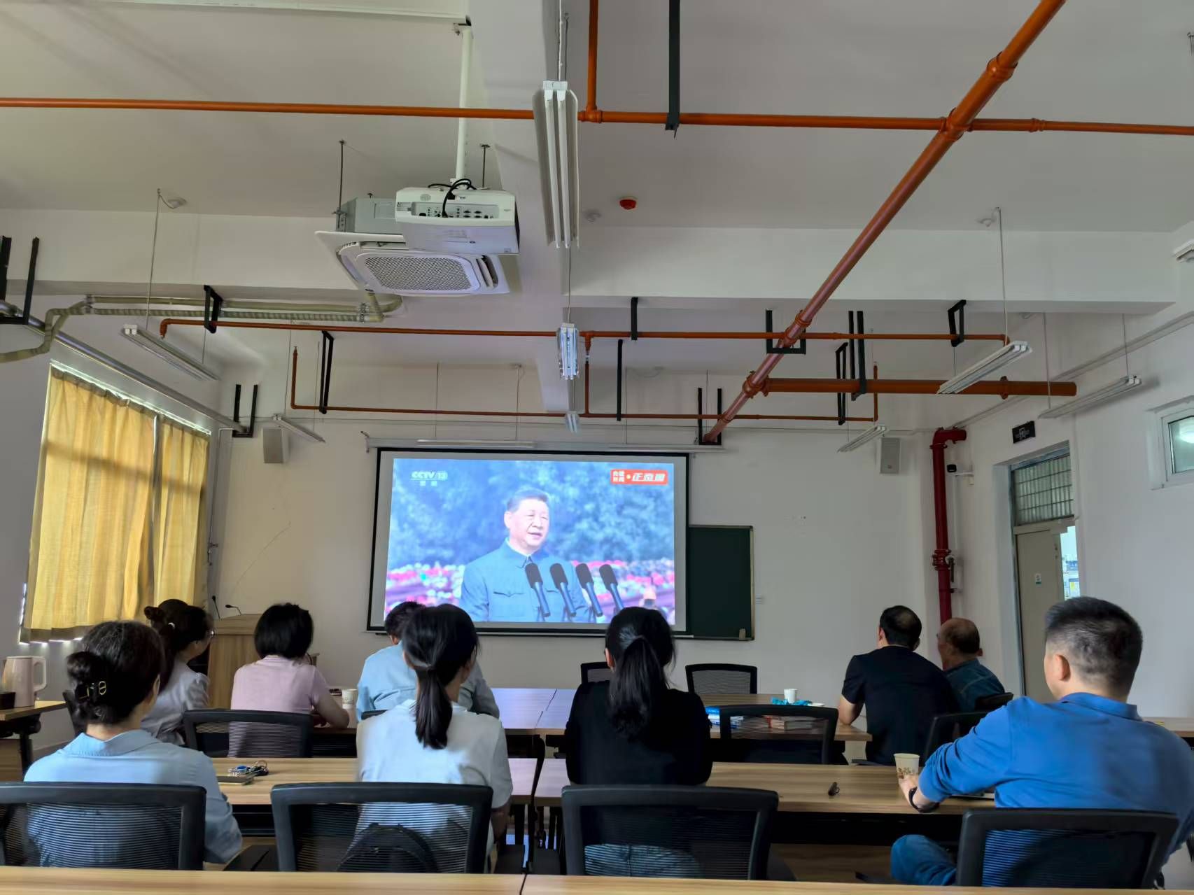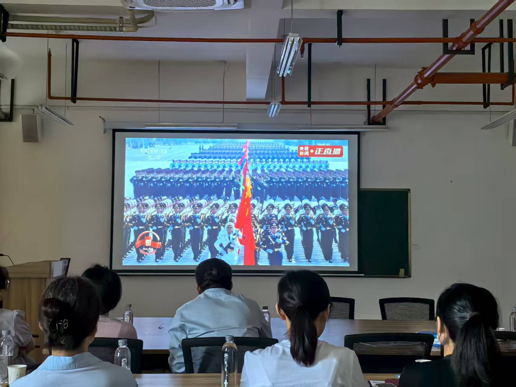 2025年9月3日上午,在中国人民抗日战争暨世界反法西斯战争胜利80周年这个庄严的历史时刻,工程综合实训中心党支部组织全体党员在工训楼603会议室集中收看了盛大的阅兵仪式实况转播。